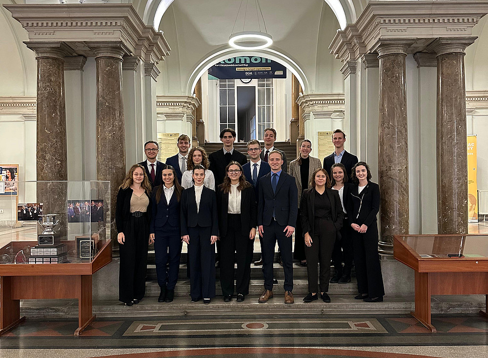 Nach zwei intensiven Tagen der Recherche fanden schlussendlich die mündlichen Verhandlungen vor einem RichterInnenpanel statt. Dafür stellten sich freundlicherweise Wiss.-Mit. Timotheus Staab, Wiss.-Mit. Jasper Kurth, Hendrik Heidlindemann (alle HHU) sowie Kálmán Márk Varga und Gábor Bazsó der ELTE und Mag. Natascha Gojkovic (KFU) zur Verfügung. Durch gezielte Fragen und konstruktives Feedback erhielten die TeilnehmerInnen wertvolle Einblicke in die Anforderungen eines mündlichen Plädoyers und konnten wichtige Erfahrungen für die bevorstehende Saison sammeln.