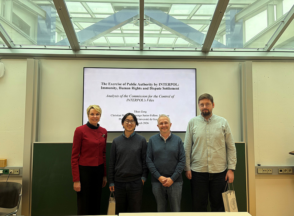 Im Rahmen des REWI Fellowship Programms durften wir im März 2026 Herrn Tihao Zeng bei uns begrüßen. Tihao Zeng ist Teaching Assistant an der Geneva Academy of International Humanitarian Law and Human Rights und PhD-Student im dritten Jahr an der rechtswissenschaftlichen Fakultät der Universität Genf. In seiner wissenschaftlichen Tätigkeit beschäftigt er sich mit der Überschneidung von internationalen Institutionen, Menschenrechten und rechtlicher Verantwortlichkeit, wobei der Fokus auf internationalen Organisationen und deren Streitbeilegung liegt. Während seines Aufenthaltes in Graz beschäftigte er sich intensiv mit zahlreichen Fällen betreffend den Sicherheitsrat der Vereinten Nationen sowie INTERPOL. Zum Abschluss seiner Tätigkeit in Graz hielt Zeng einen spannenden Vortrag über die Mechanismen zur Einhaltung von Menschenrechten innerhalb INTERPOLs, in dem er eine Vielzahl an Fällen präsentierte und einen Einfluss verschiedener Menschenrechtsinstrumente und -gerichte auf die Kommission zur Kontrolle von INTERPOL-Akten darlegte.